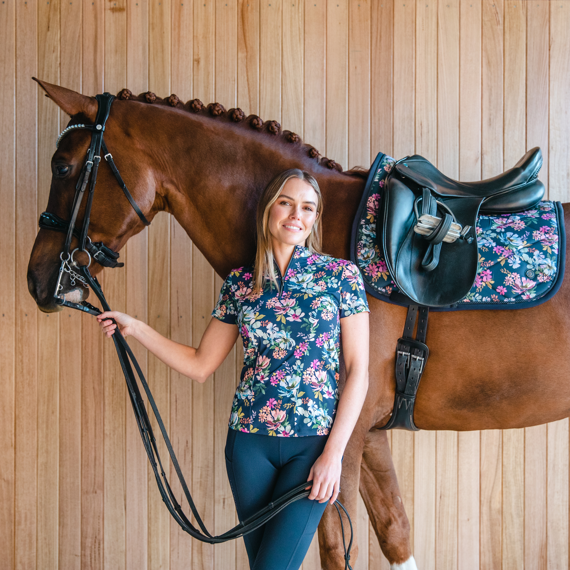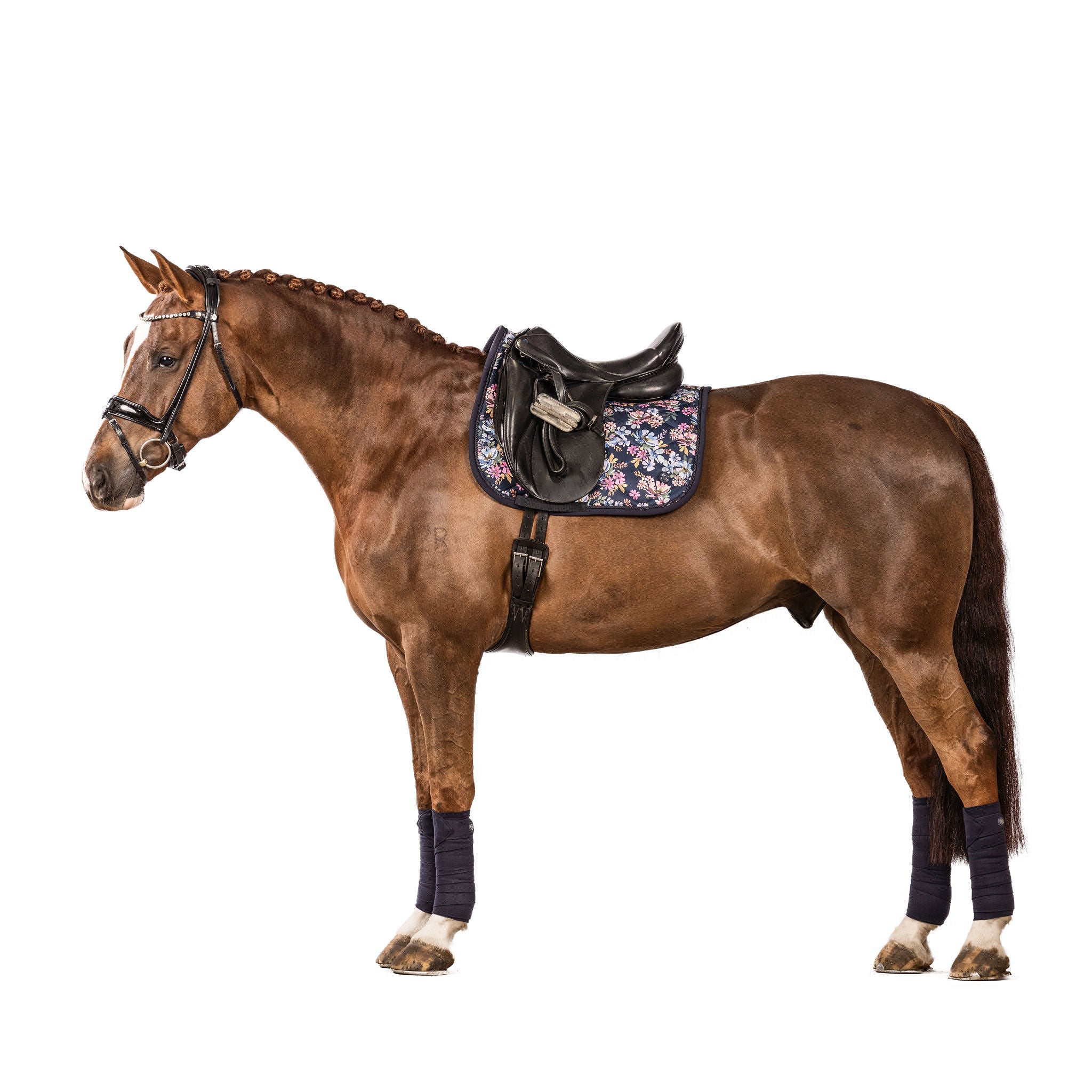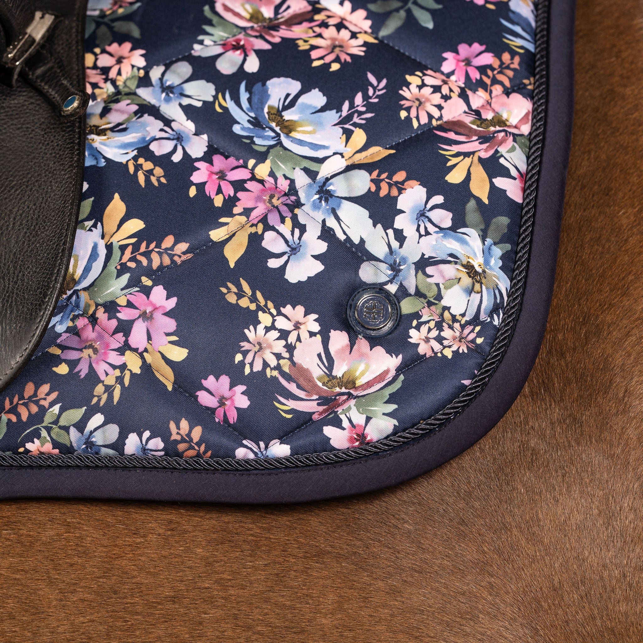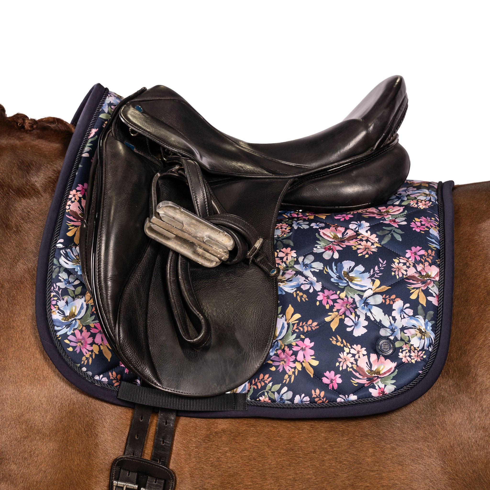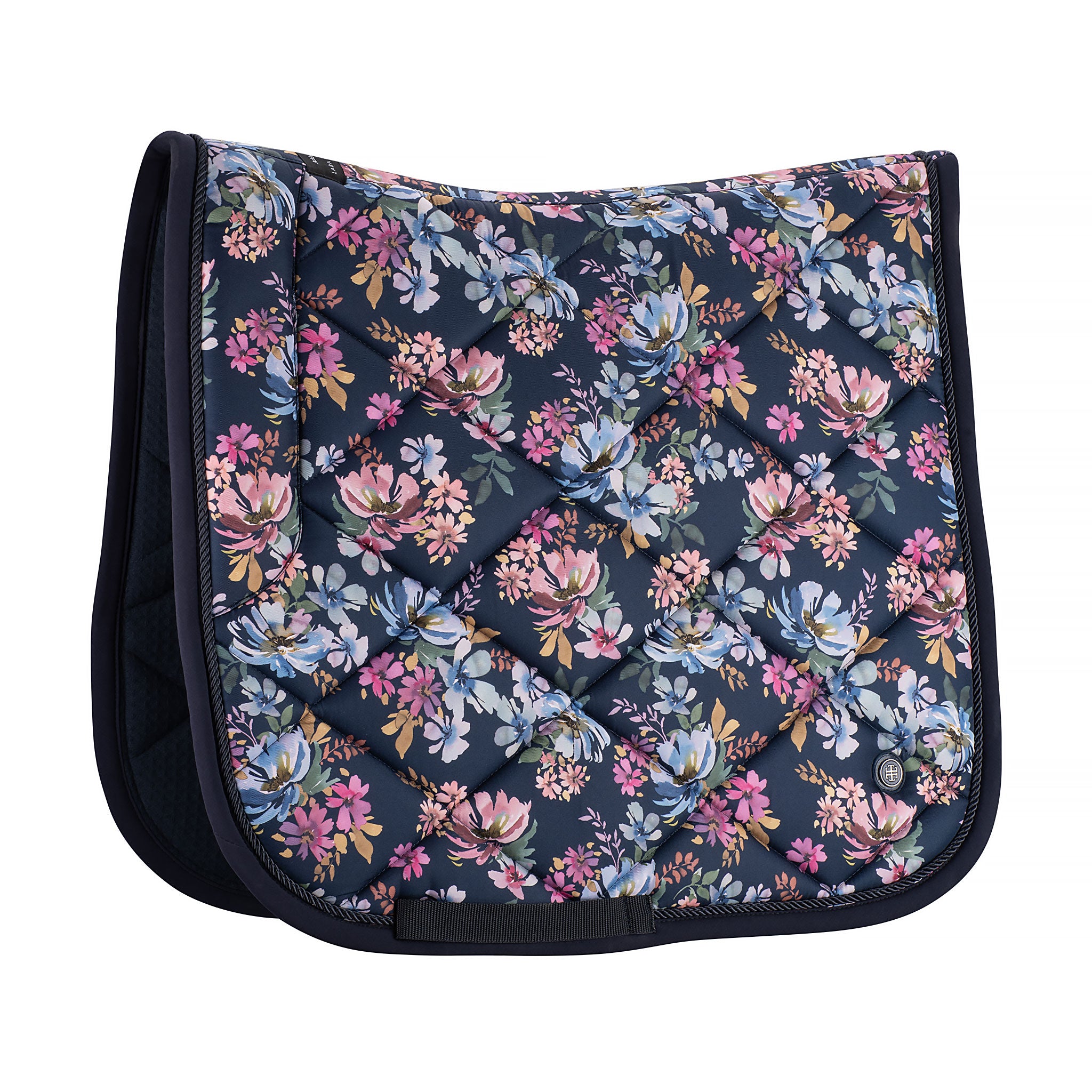 This ultra soft dressage saddle pad is the ultimate in comfort for your horse. Super soft cotton waffle weave lining and eco fill offer natural breathability. The Ashlie Floral print is accented by a complimentary diamond quilt.