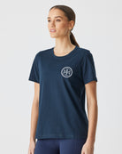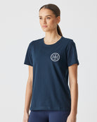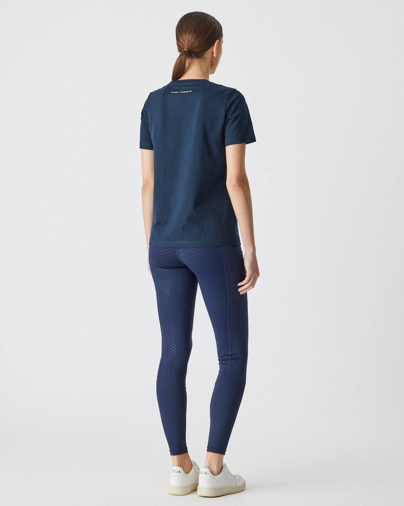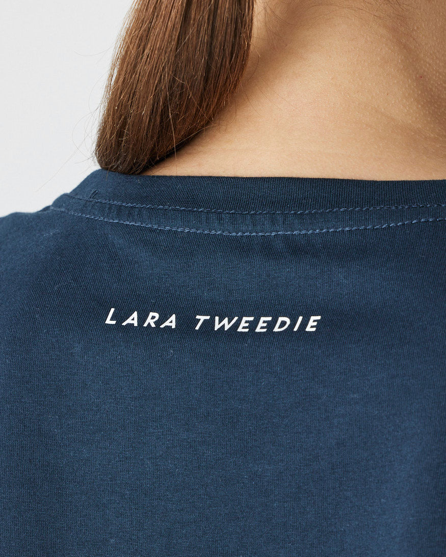 Details:White embroidery logo on navy t-shirt. Lara Tweedie logo transfer on back neck.