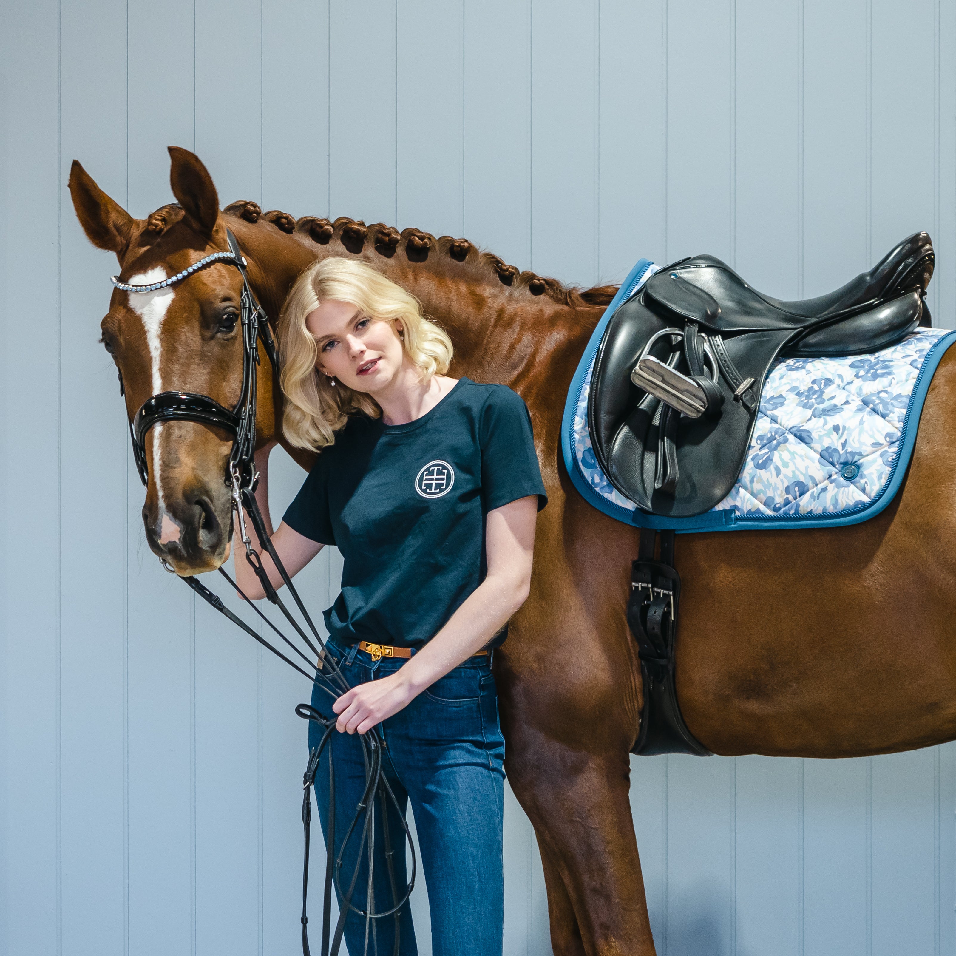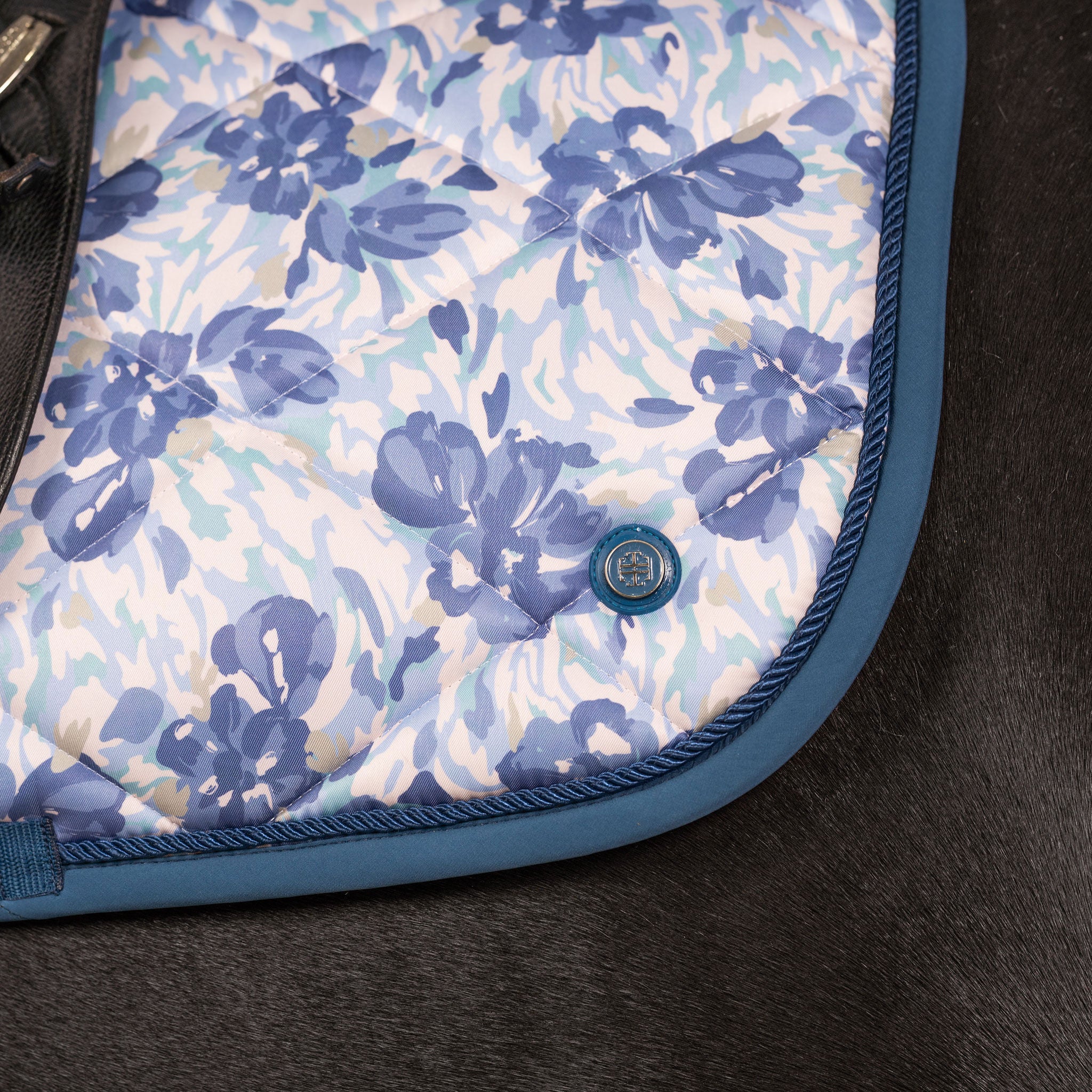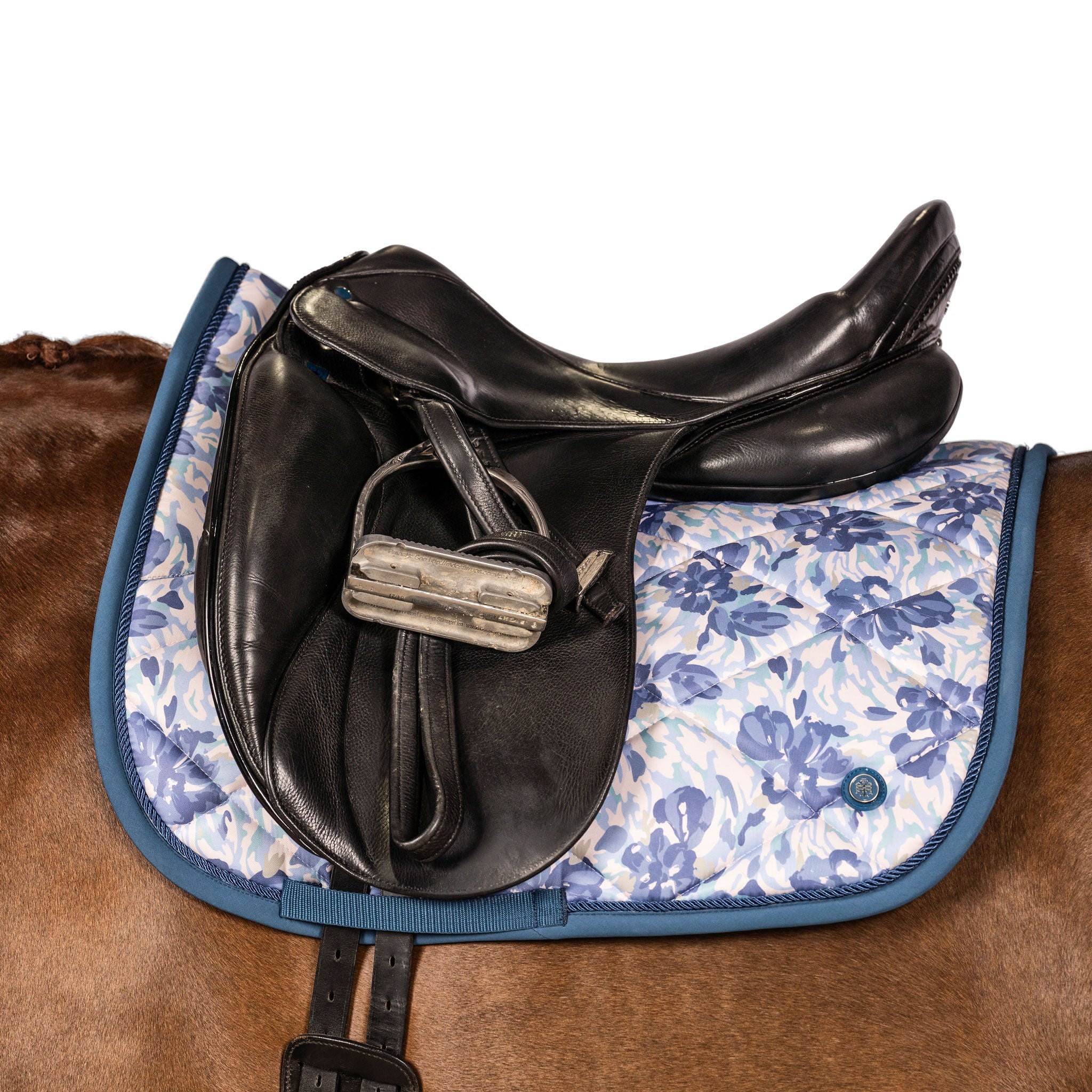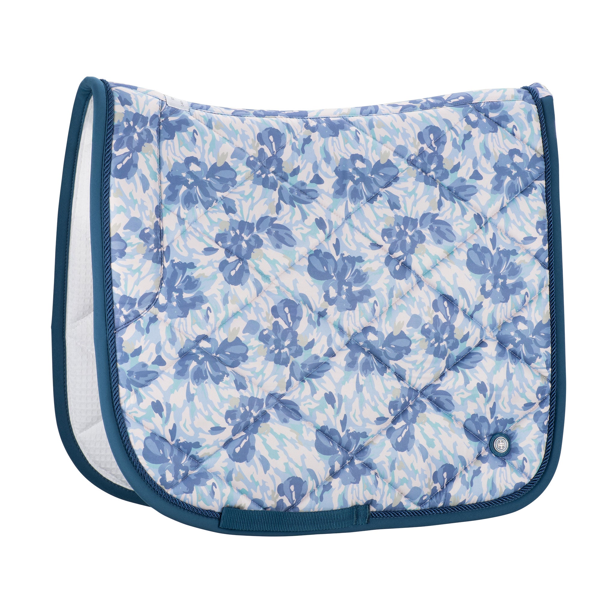 This ultra soft dressage saddle pad is the ultimate in comfort for your horse. Super soft cotton waffle weave lining and eco fill offer natural breathability. The Katie Camo Floral print is accented by a complimentary diamond quilt.