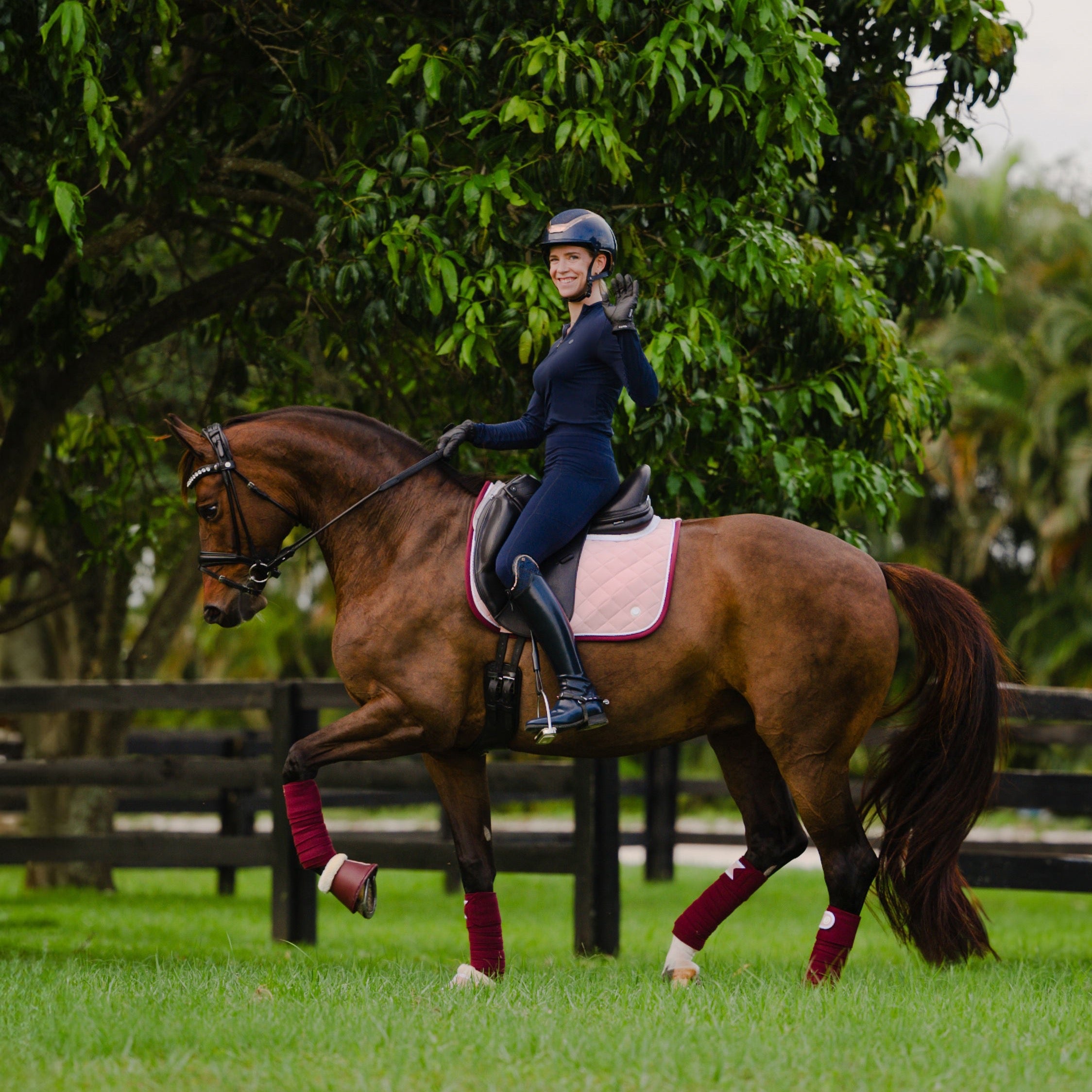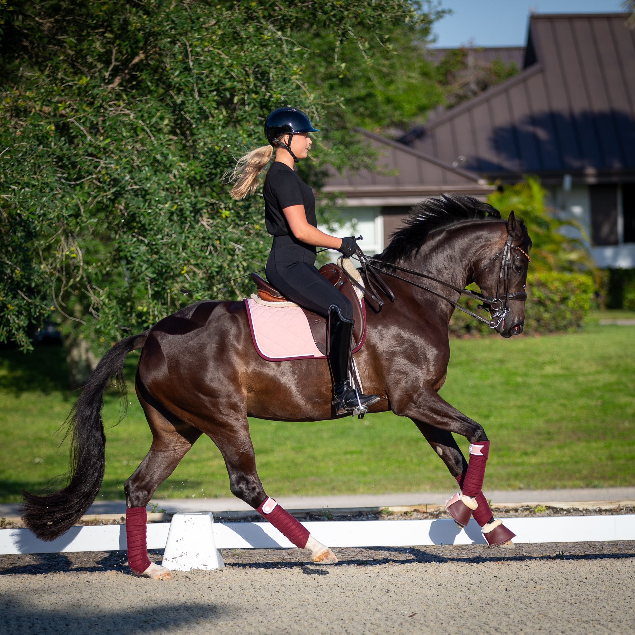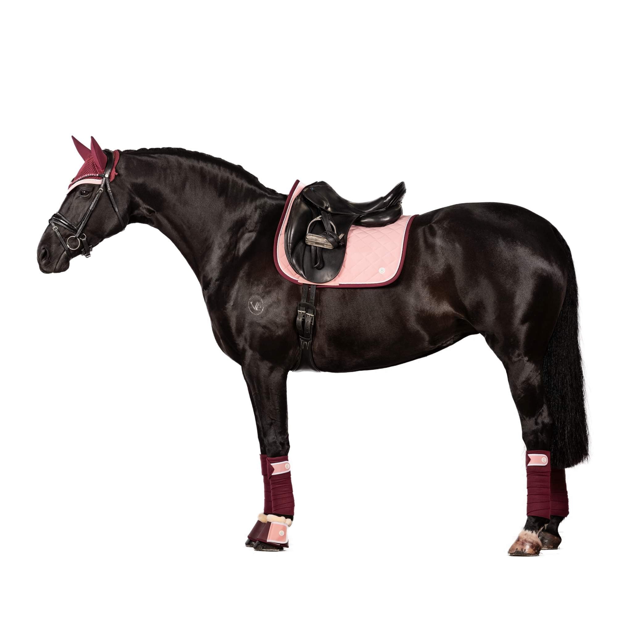 Matching burgundy trimmed ear bonnets, bandages and bell boots are also available.