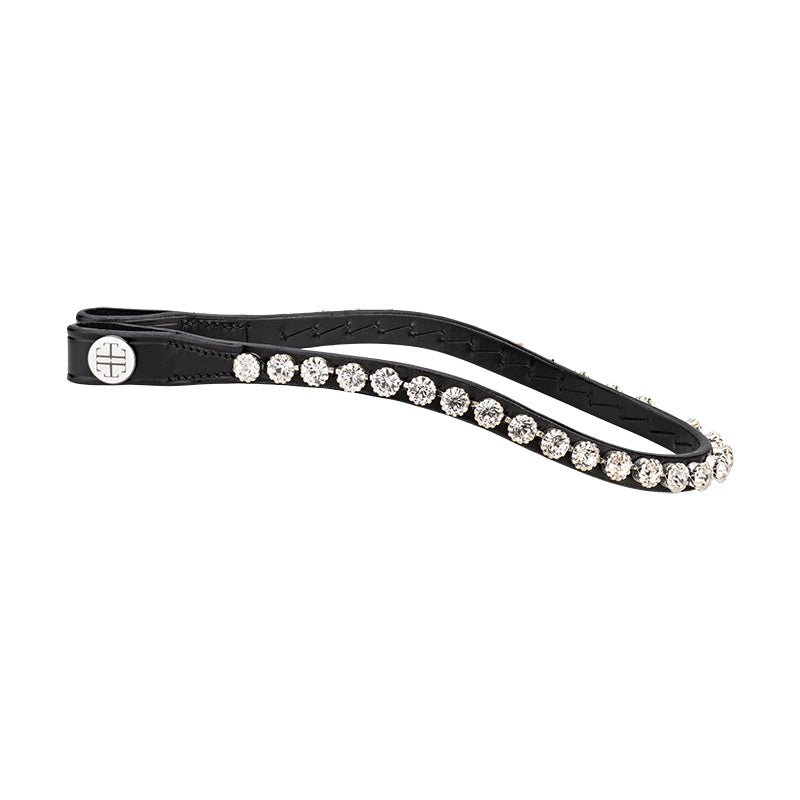 The crown piece is anatomically designed and slimmed behind the ears to increase the height at which the brow band can be positioned to ensure adequate clearance of the orbital bone. The noseband is slim as it traverses the body of the mandible and features rounded dee rings. The streamlined noseband ensures the cheek pieces maintain close contact with the horse as they connect to the bit.