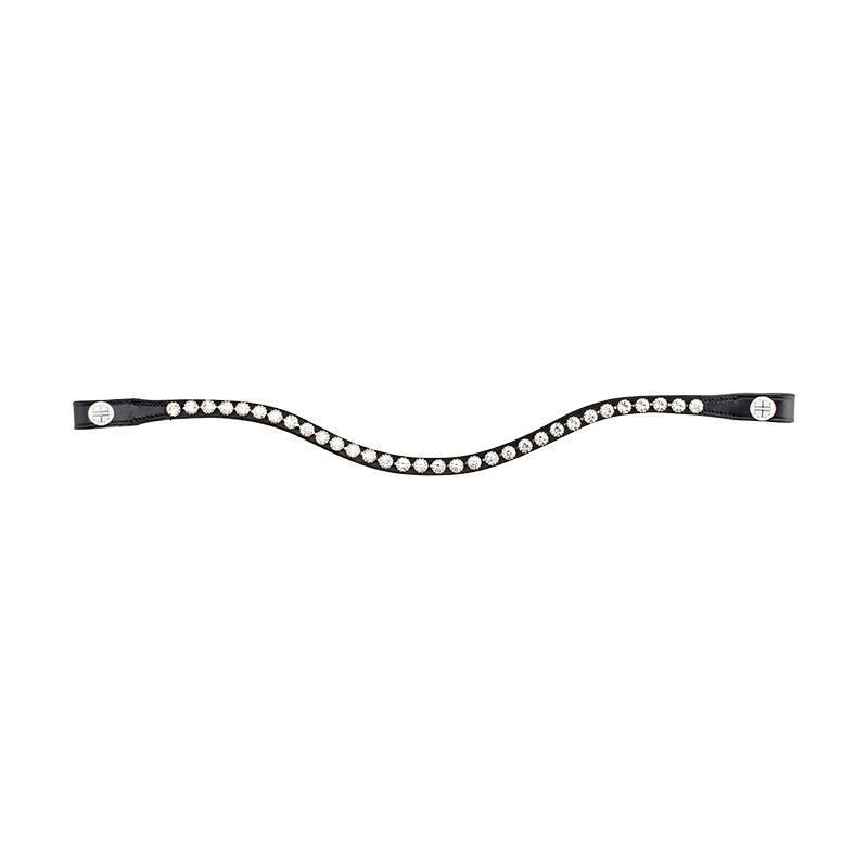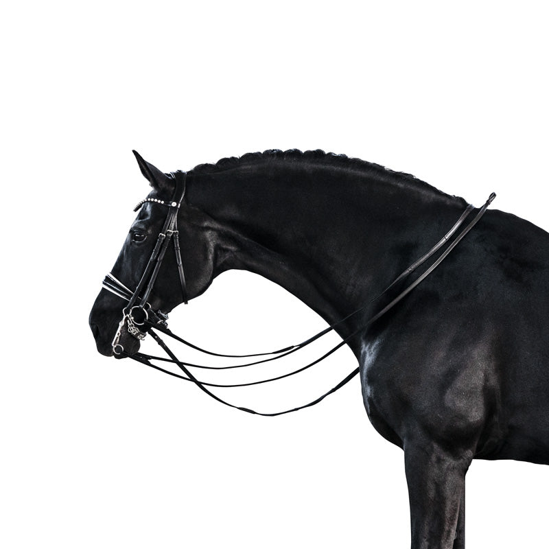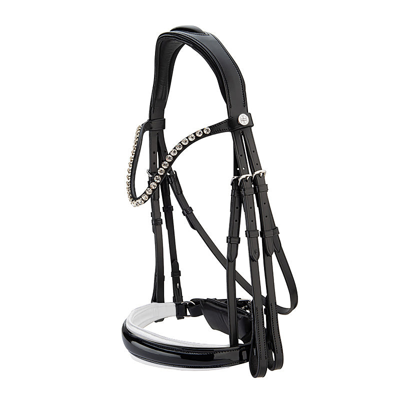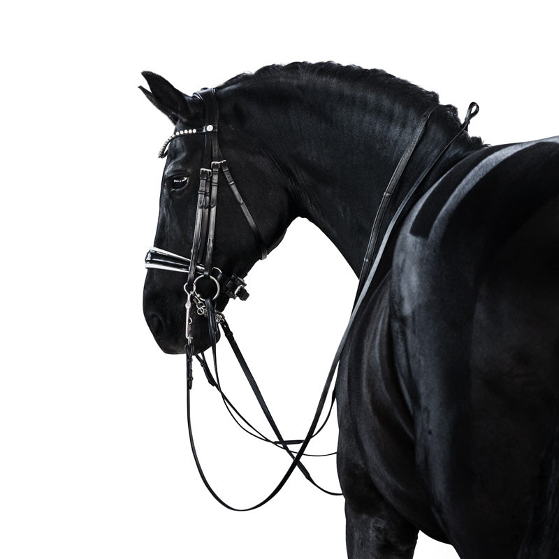 The crown piece is anatomically designed and slimmed behind the ears to increase the height at which the brow band can be positioned to ensure adequate clearance of the orbital bone. The noseband is slim as it traverses the body of the mandible and features rounded dee rings. The streamlined noseband ensures the cheek pieces maintain close contact with the horse as they connect to the bit.