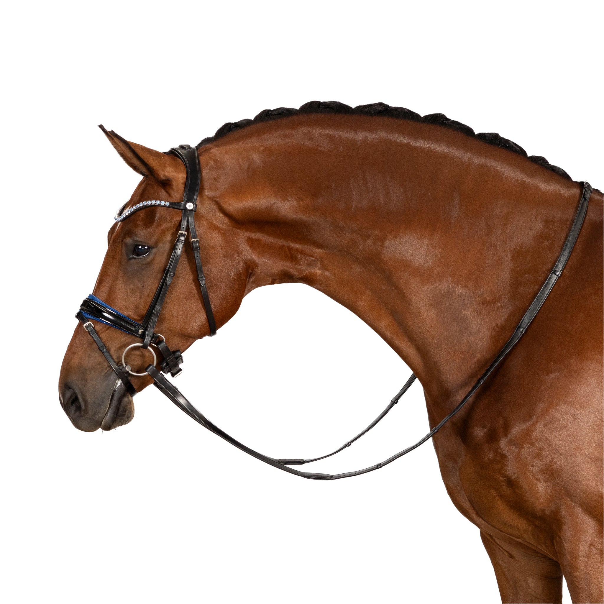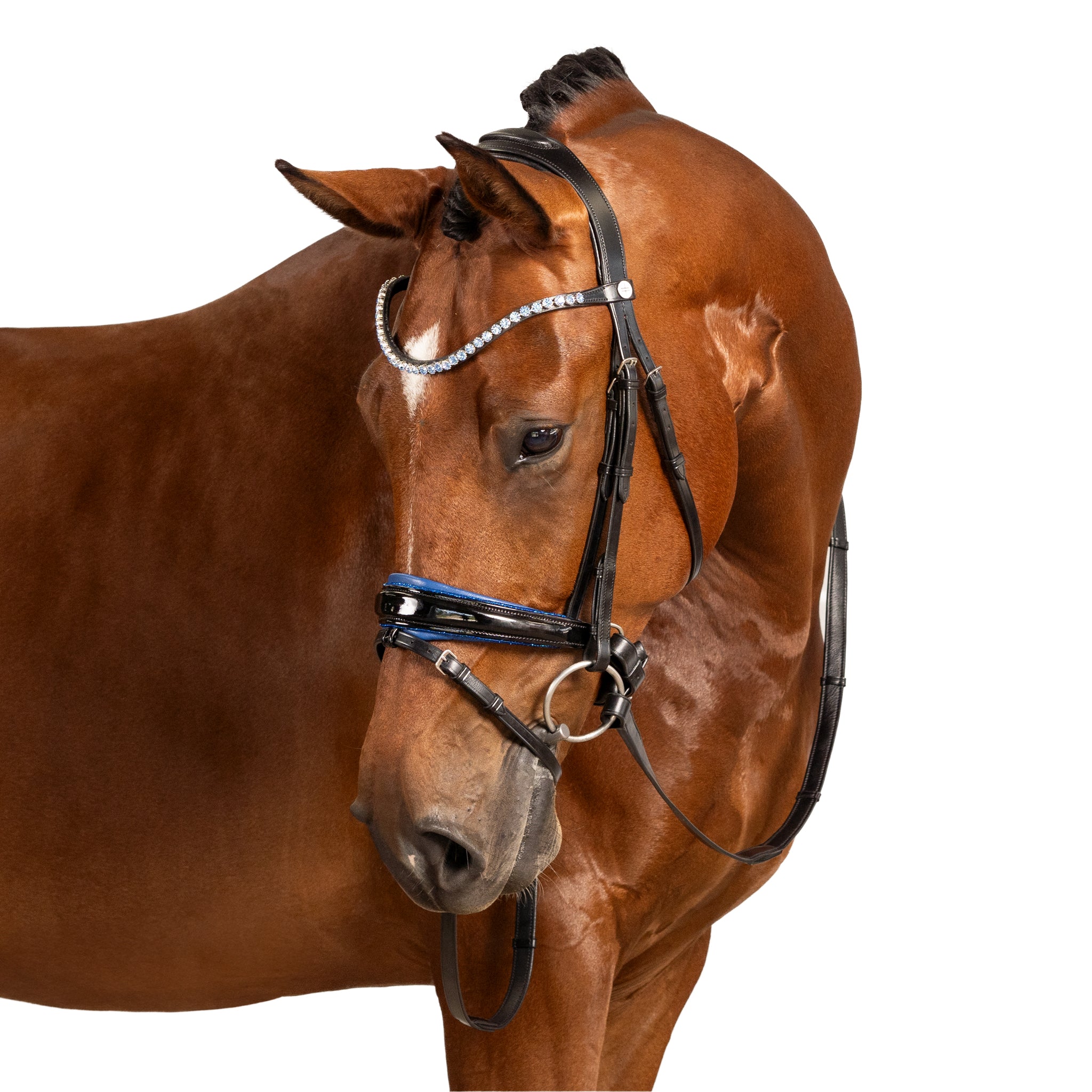 This bridle ticks all of the boxes in terms of style, functionality and comfort. The crown piece is anatomically designed and slimmed behind the ears to increase the height at which the brow band can be positioned to ensure adequate clearance of the orbital bone. The noseband is slim as it traverses the body of the mandible and features rounded dee rings. The streamlined noseband ensures the cheek pieces maintain close contact with the horse as they connect to the bit.