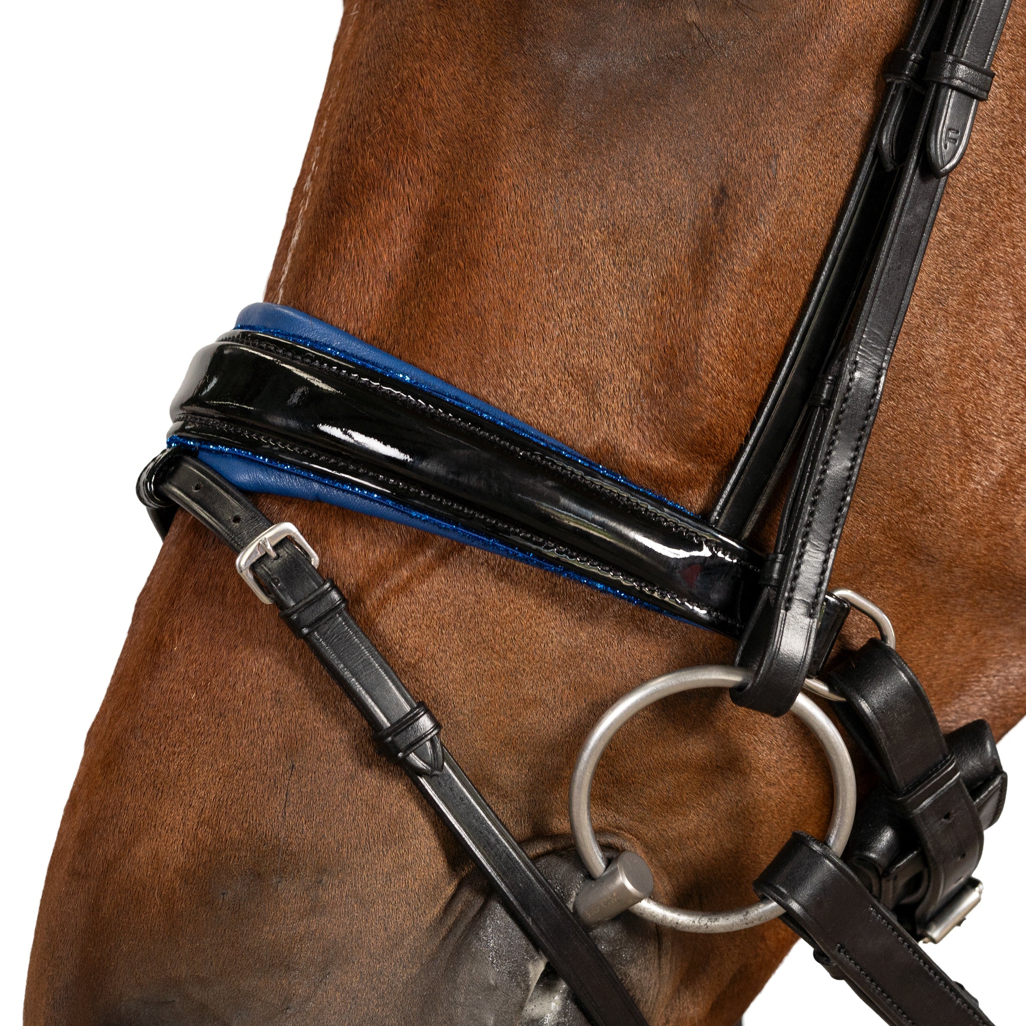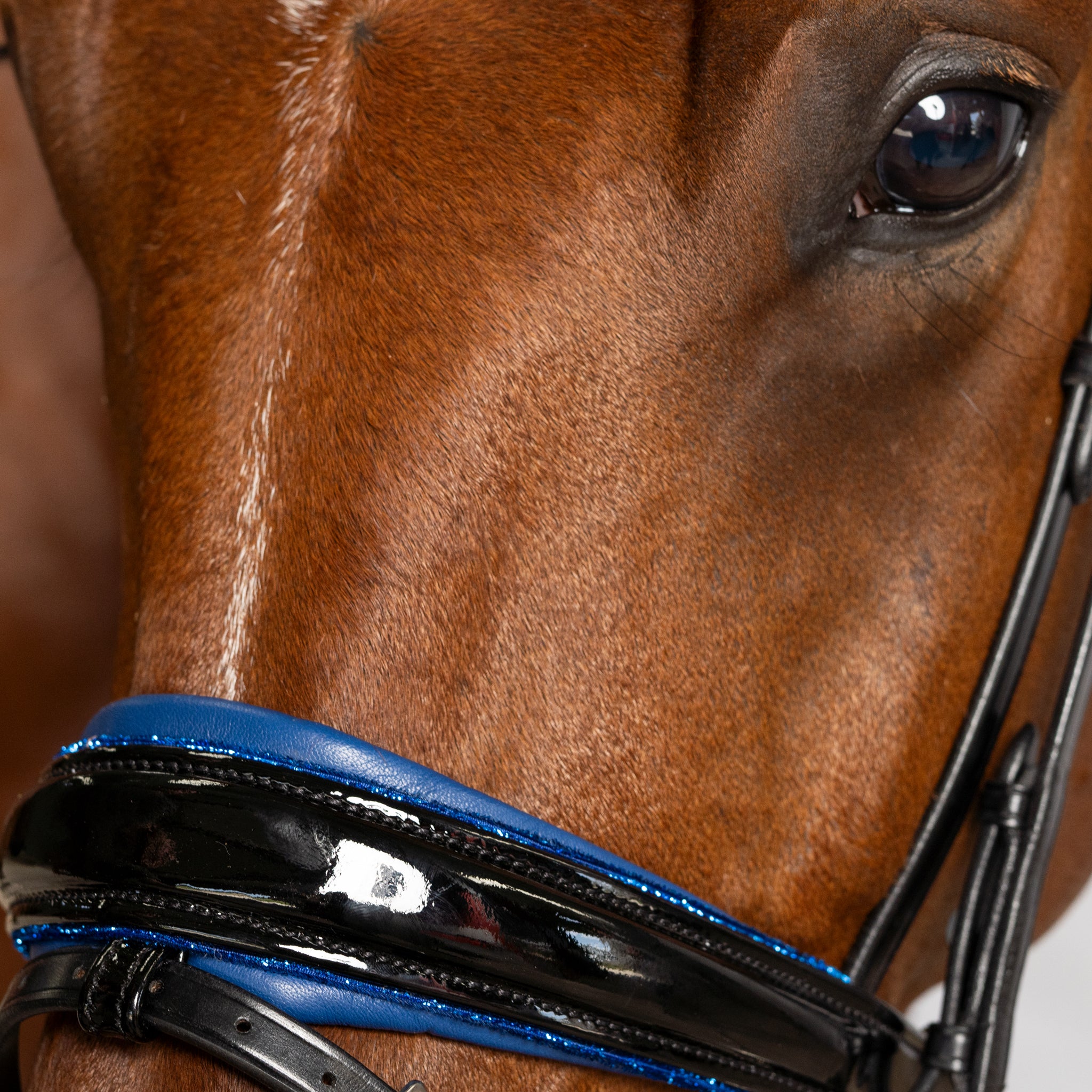 The LT Navy Glitter Snaffle Bridle brings all the razzle dazzle with a sky blue crystal brow band and and patent leather noseband featuring subtle yet enchanting navy glitter piping framed by navy leather padding. We made this one for you navy lovers!