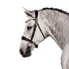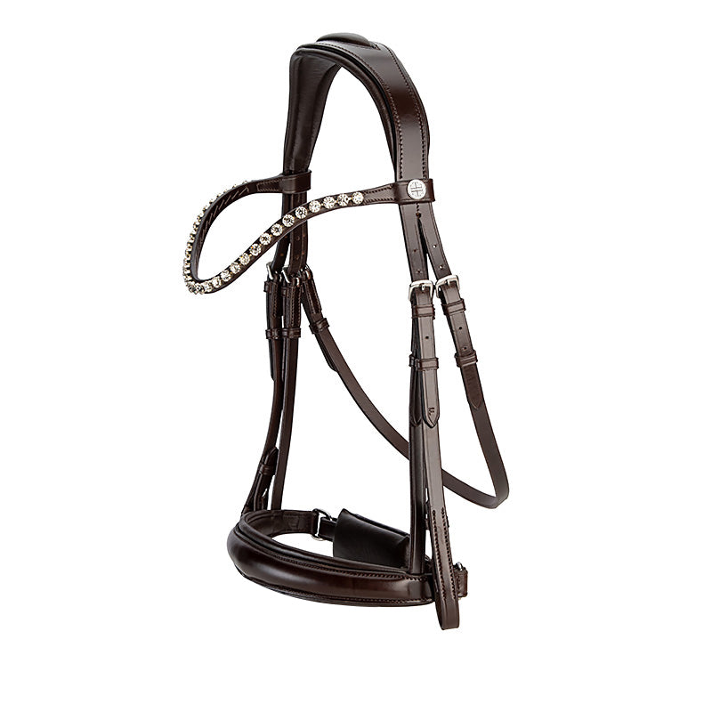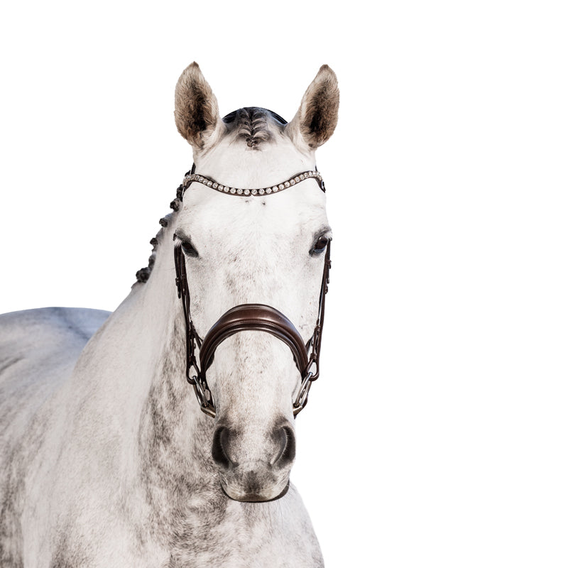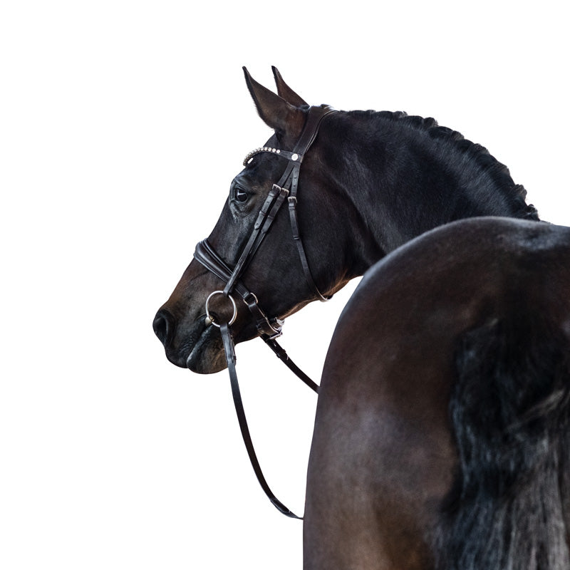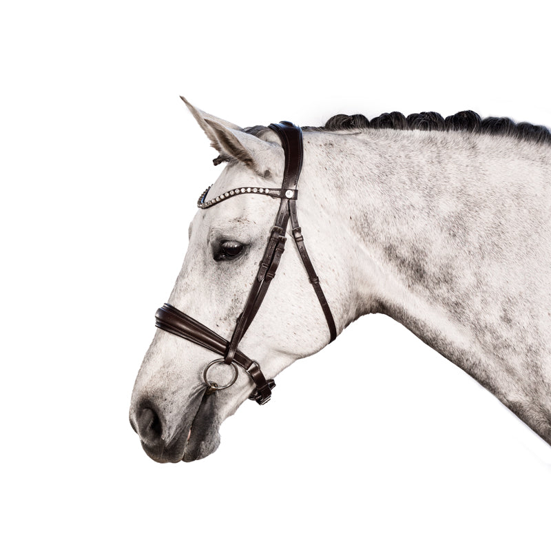 The crown piece is anatomically designed and slimmed behind the ears to increase the height at which the brow band can be positioned to ensure adequate clearance of the orbital bone. The noseband is slim as it traverses the body of the mandible and features rounded dee rings. The streamlined noseband ensures the cheek pieces maintain close contact with the horse as they connect to the bit.