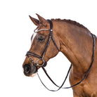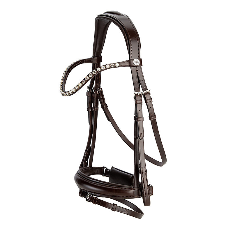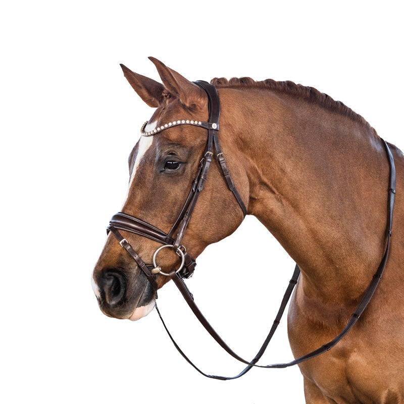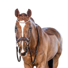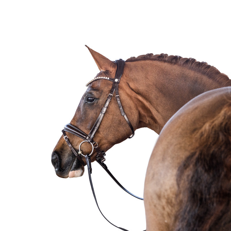 The crown piece is anatomically designed and slimmed behind the ears to increase the height at which the brow band can be positioned to ensure adequate clearance of the orbital bone. The noseband is slim as it traverses the body of the mandible and features rounded dee rings. The streamlined noseband ensures the cheek pieces maintain close contact with the horse as they connect to the bit.
