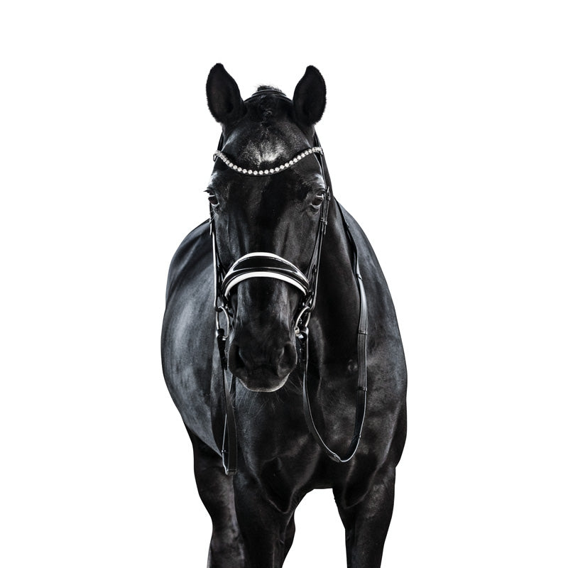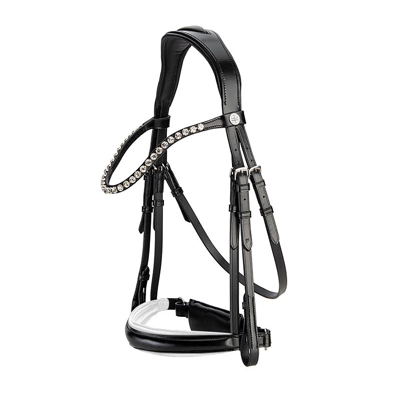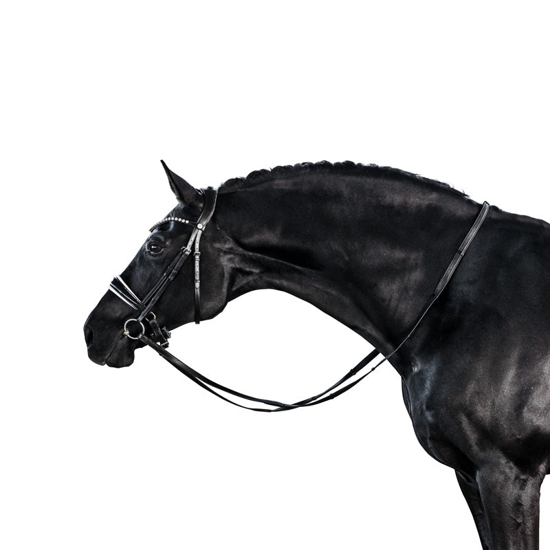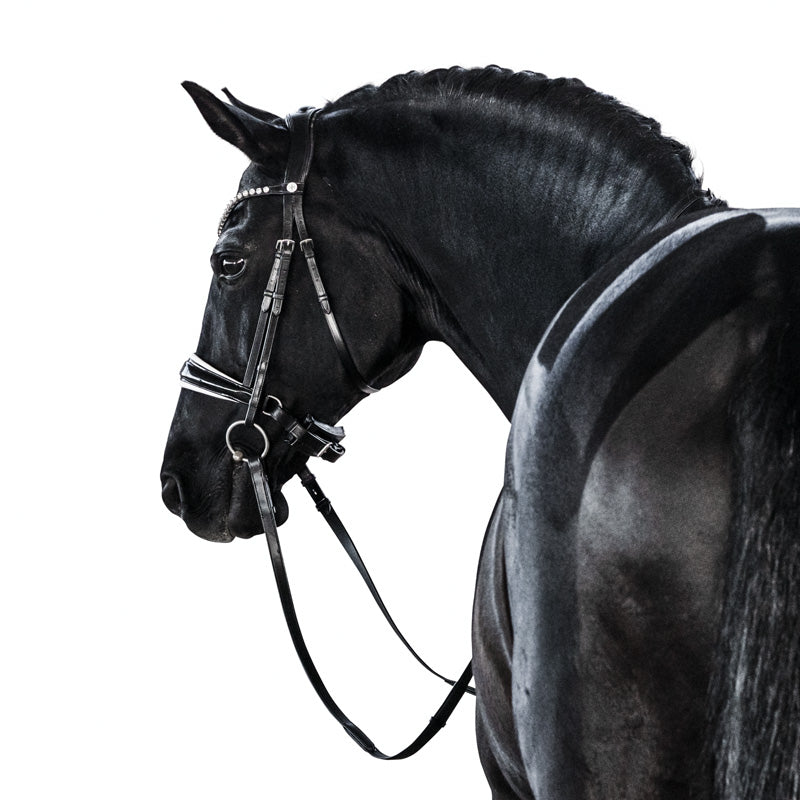 The crown piece is anatomically designed and slimmed behind the ears to increase the height at which the brow band can be positioned to ensure adequate clearance of the orbital bone. The noseband is slim as it traverses the body of the mandible and features rounded dee rings. The streamlined noseband ensures the cheek pieces maintain close contact with the horse as they connect to the bit.