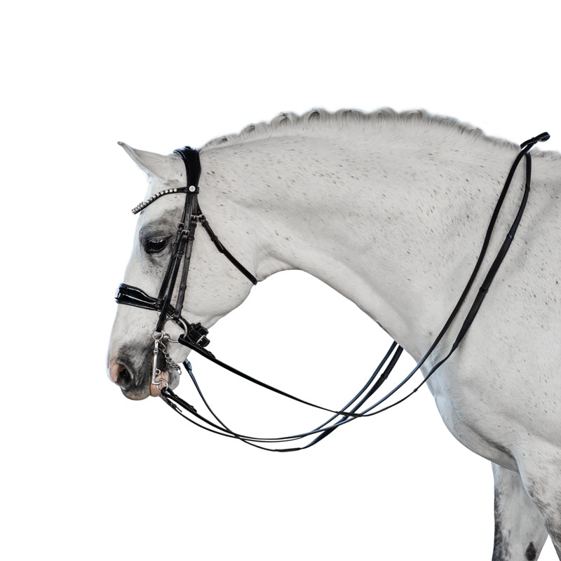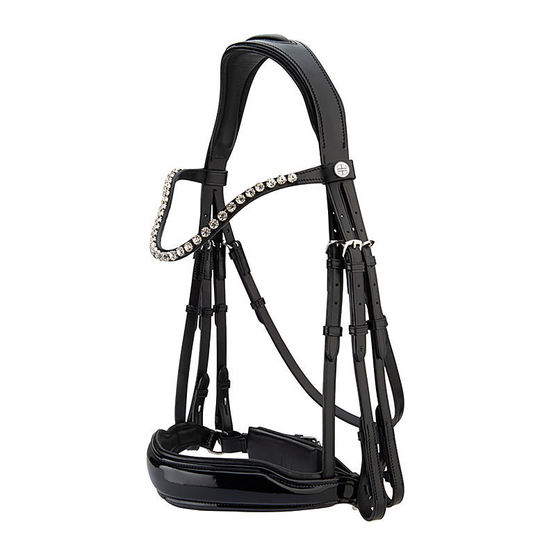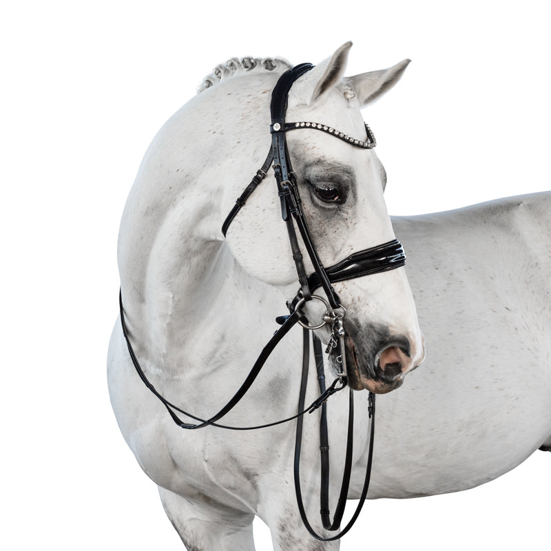 The wide, patent leather noseband is cut away below the facial crest and slims as it traverses the body of the mandible. The noseband features rounded dee rings and our ultra soft crank pad. The streamlined noseband ensures the cheek pieces maintain close contact with the horse as they connect to with the bit.